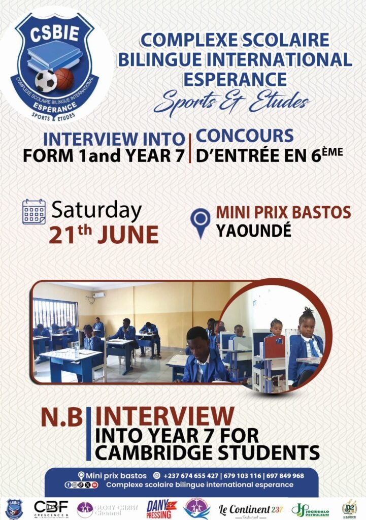 Le Complexe Scolaire Bilingue International Espérance est fier d’annoncer les inscriptions pour la prochaine année scolaire ! Nous offrons un programme intégré « Sports & Études » conçu pour l’excellence académique et sportive.